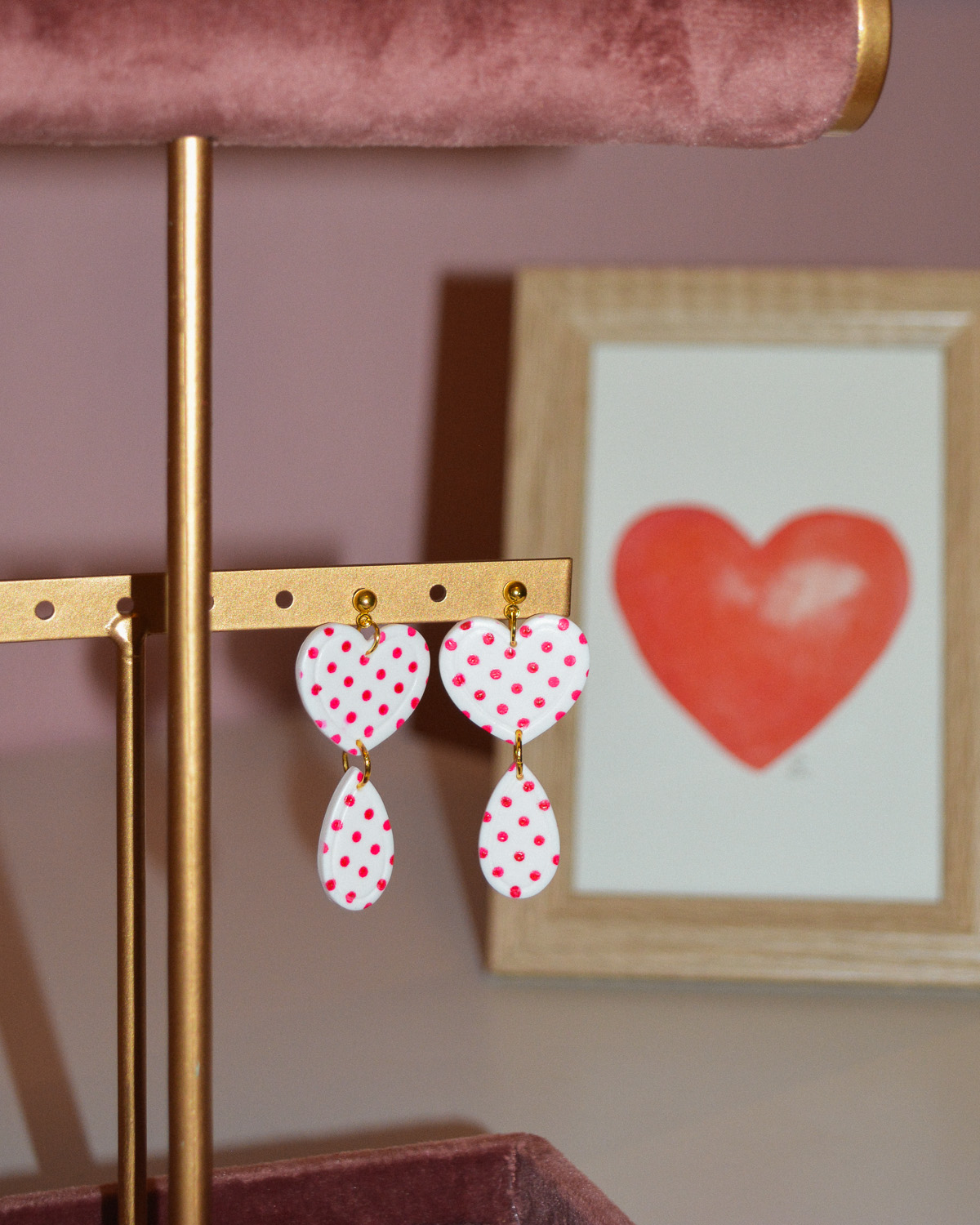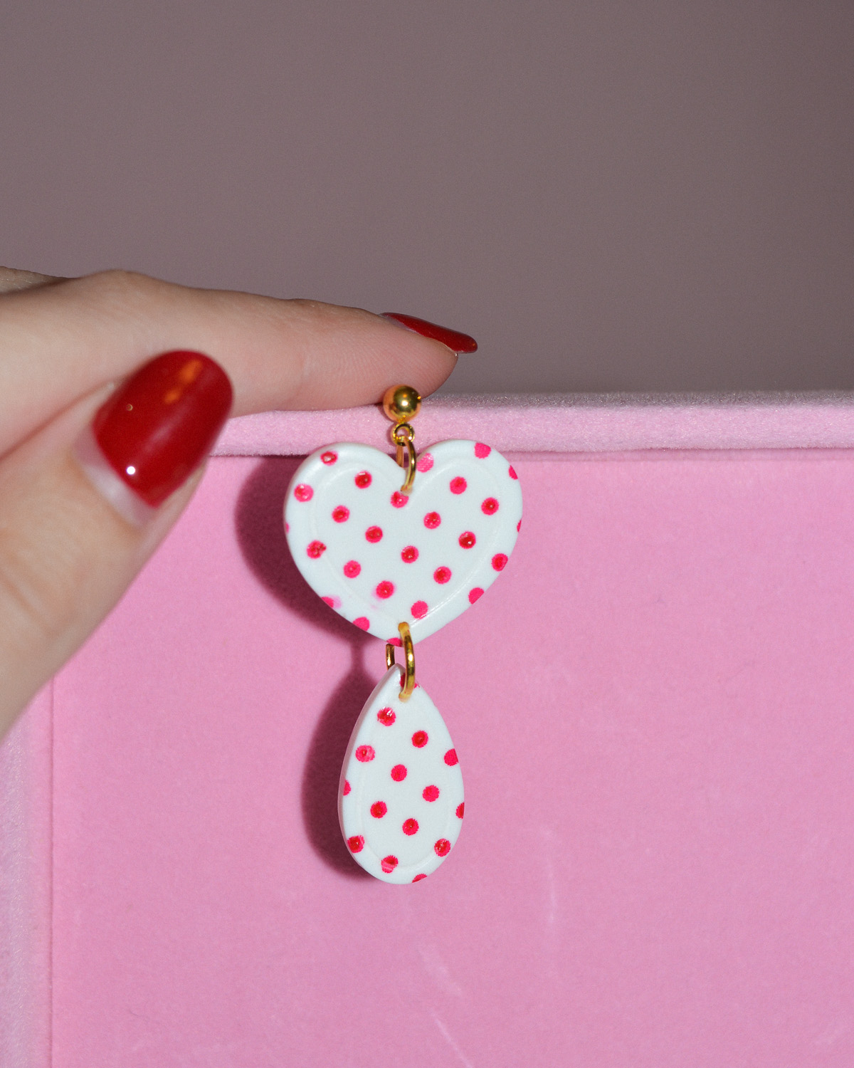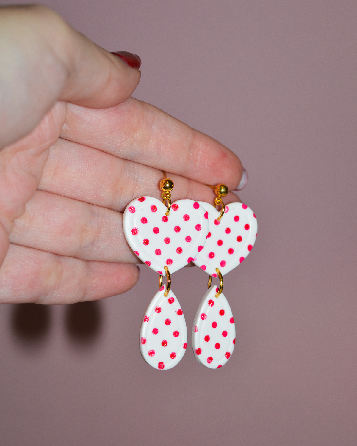 Χειροποίητα σκουλαρίκια λευκές καρδιές και σταγόνες από πηλό με φούξια πουά μοτίβο.