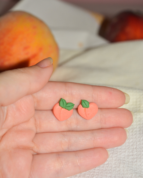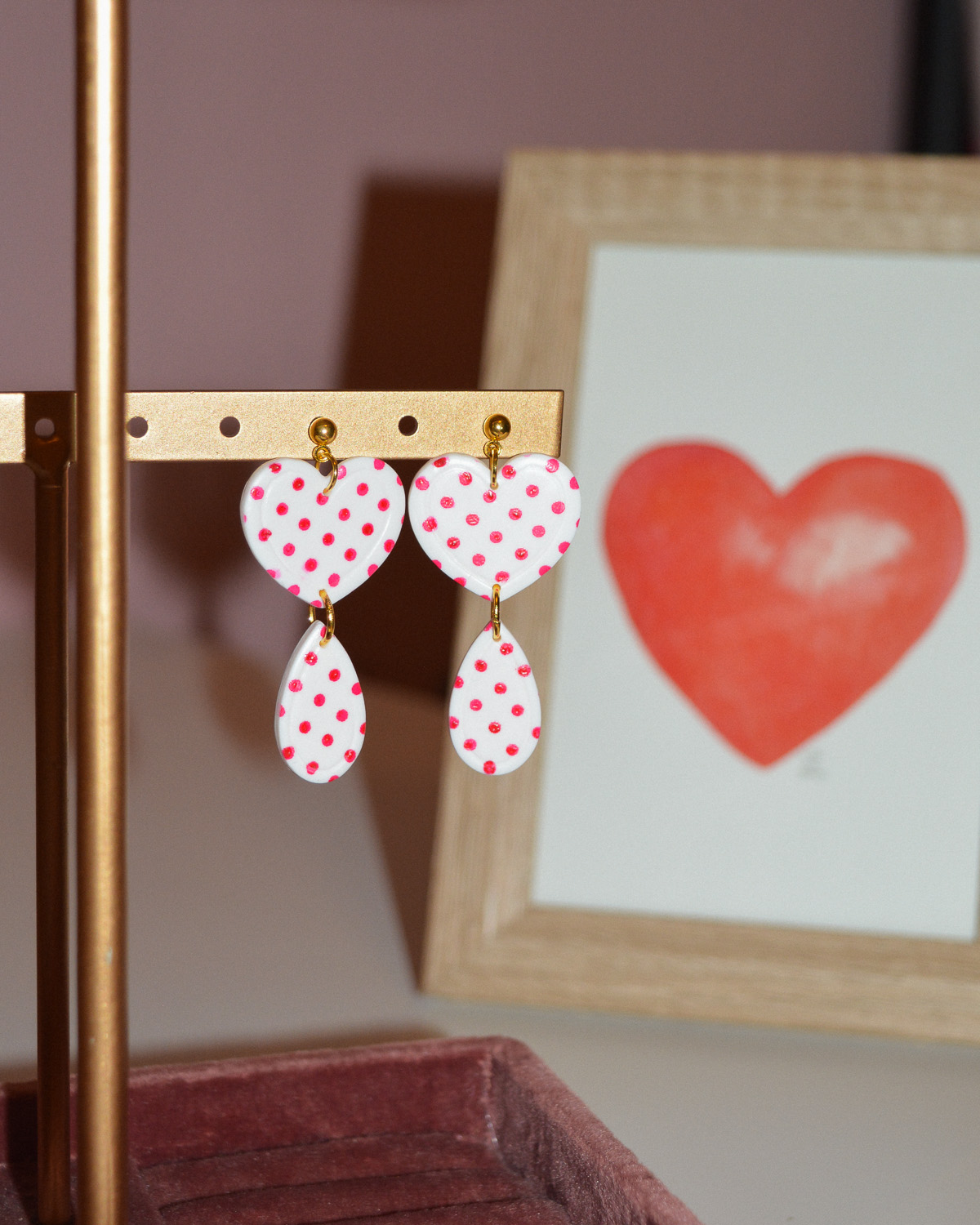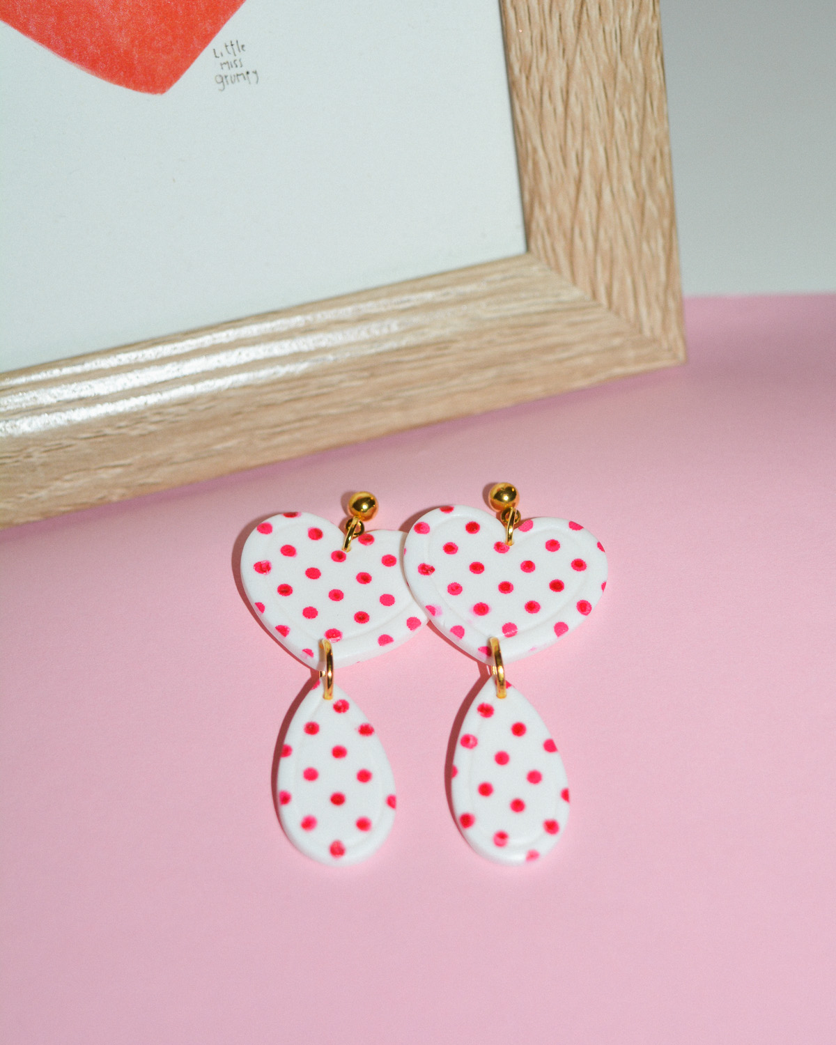 Χειροποίητα σκουλαρίκια λευκές καρδιές και σταγόνες από πηλό με φούξια πουά μοτίβο.